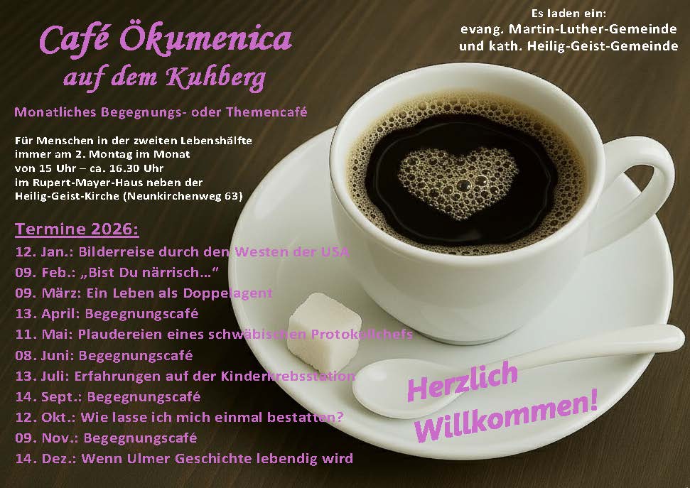 Das Café Ökumenica ist eine Veranstaltung der evangelischen Martin-Luther- und der katholischen Heilig-Geist-Gemeinde und lädt besonders Menschen in der zweiten Lebenshälfte ein. Es ist für alle Besucher offen, bietet Kaffee, Gebäck und Gespräch und steht für Begegnung und Programm: „Begegnungscafés“ und „Themencafés“ wechseln einander ab.